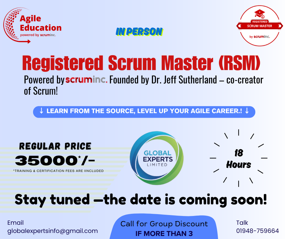 Global Experts is a premier training provider specializing in professional certification courses such as Project Management Professional (PMP), Registered Scrum Master (RSM), Registered Product Owner (RPO), Certified Scrum Master (CSM), Certified Scrum Product Owner (CSPO), Lean Six Sigma Black Belt (LSSBB), and more. We offer expert-led, in-person, and online training designed to help professionals enhance their skills, achieve industry-recognized certifications, and advance their careers. Our structured courses, experienced trainers, and hands-on learning approach ensure maximum knowledge retention and real-world application.